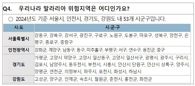 이 53개 시군구는 말라리아 위험이 높은 곳이니까, 이 지역에 가게 되면 모기에 물리지 않도록 특히 주의해야 합니다. 모기에 물리지 않도록 주의하고, 모기장을 사용하거나 모기약을 바르는 게 좋습니다.