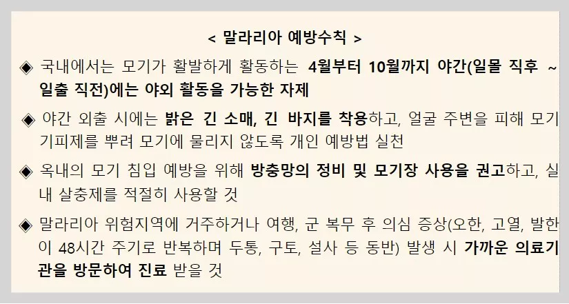 아무쪼록 말라리아 예방방법 잘 숙지하셔서 건강한 여름 보내시기 바랍니다.