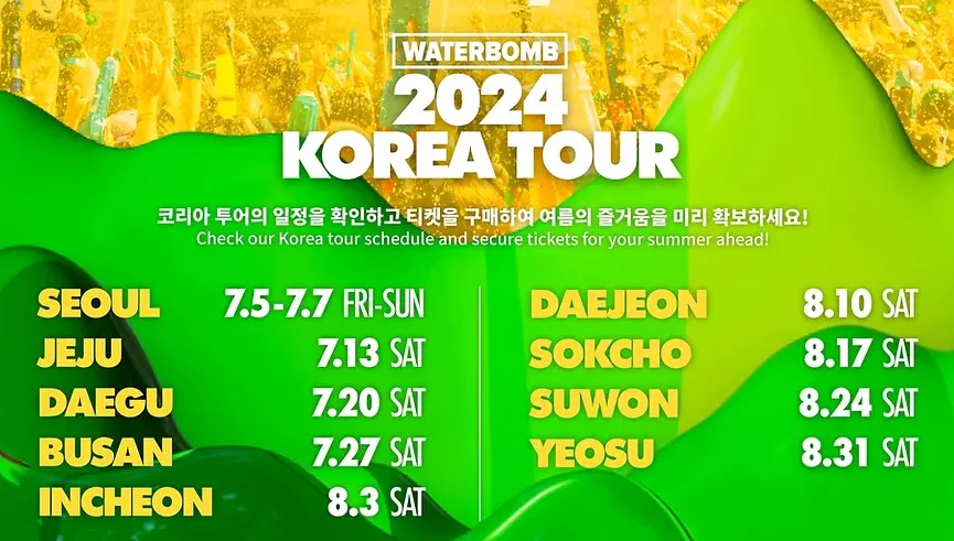 2024 워터밤이 다시 돌아왔습니다. 한여름의 신나는 페스티벌 워터밤 2024 전국 투어는 서울, 인천, 부산, 제주, 대구, 대전, 속초, 수원, 광주에서 진행이 됩니다. 티켓 가격과 예매하는 법, 라인업까지 정리해보겠습니다.