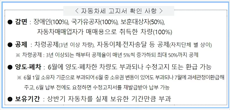 • 보유기간: 상반기 동안 실제로 차량을 보유한 기간에 따라 자동차세가 부과됩니다.