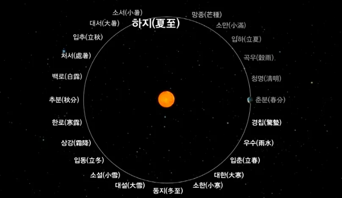 아래 그림을 보시면 24 절기 중 동지와 하지가 서로 반대편에 위치하고 있는 것을 알 수 있습니다.